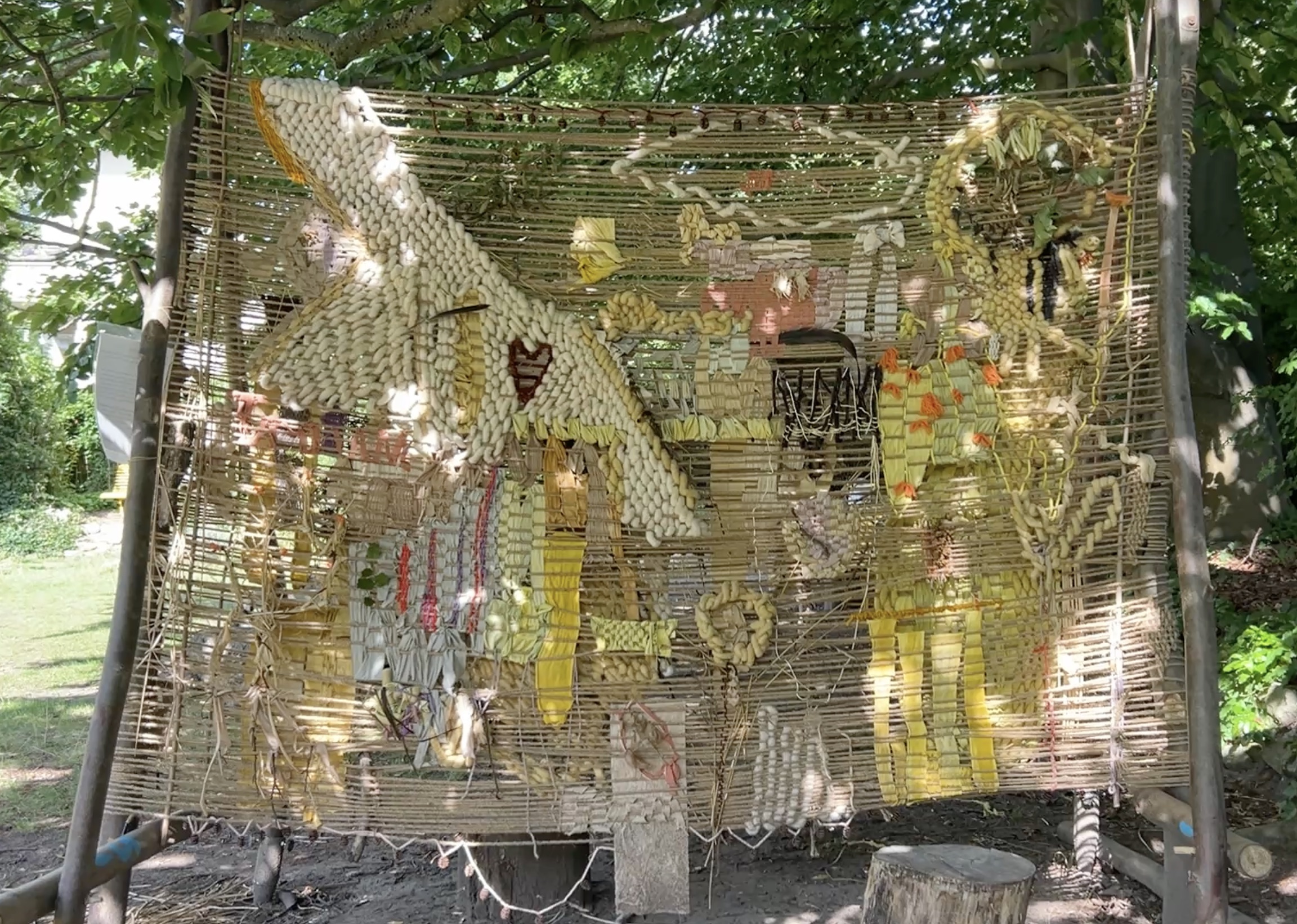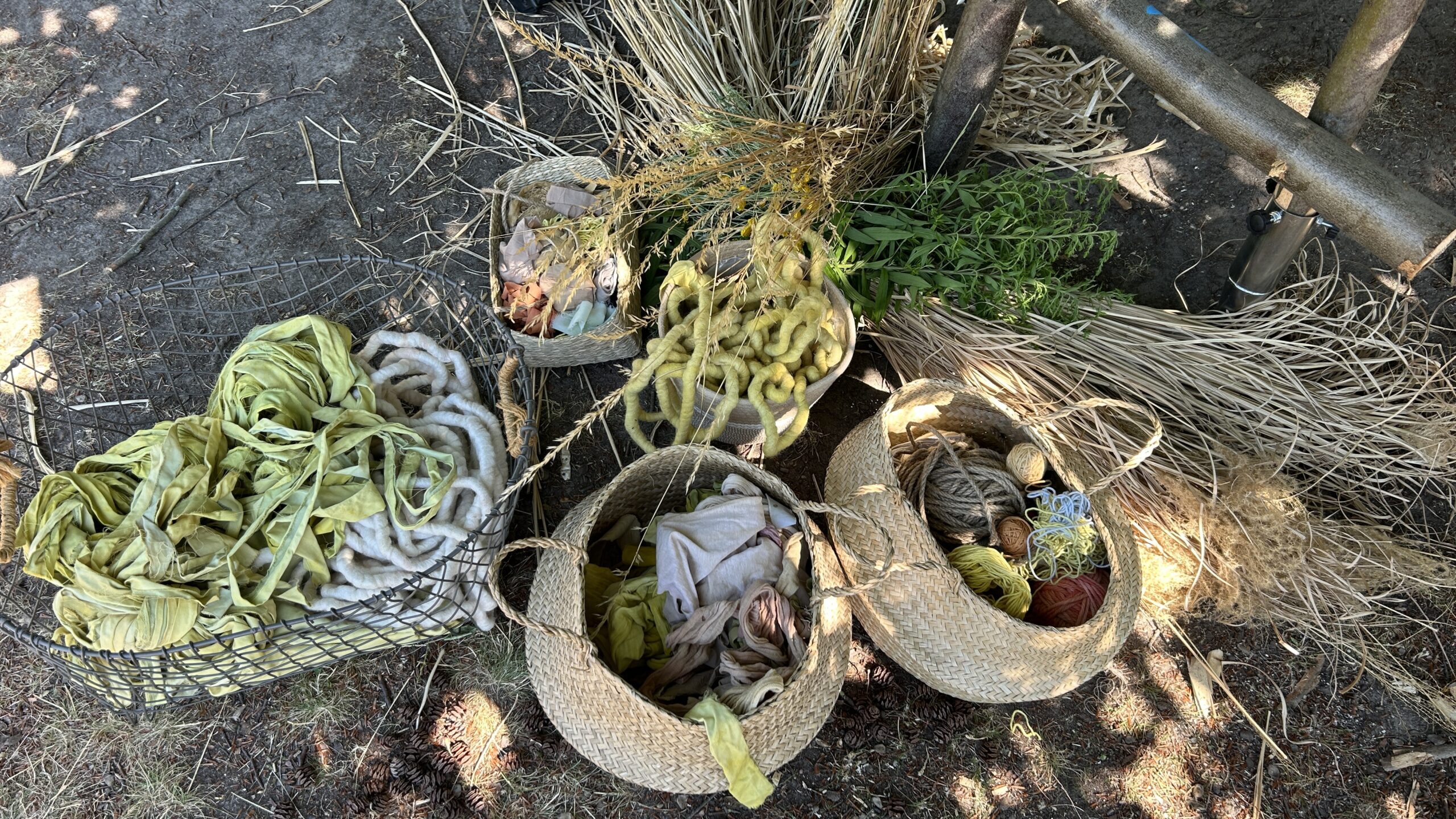 Das textile Material sowie Pflanzen zum Verweben und Verflechten stehen im Holzunterstand neben dem Webrahmen zur Verfügung. Wir bitten um einen achtsamen Umgang damit 🙂